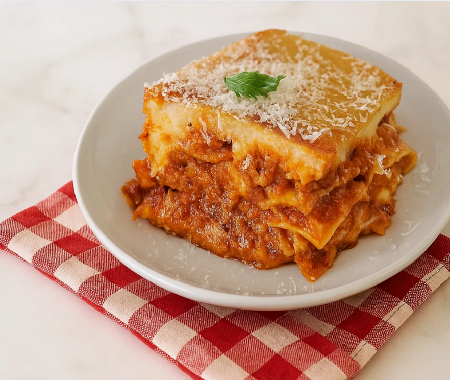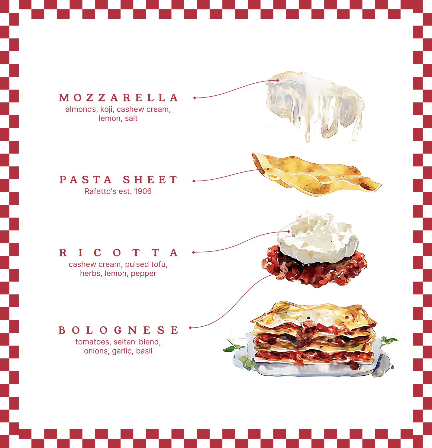 Fresh pasta layered with house-made seitan bolognese, herbed tofu ricotta, and koji-almond mozzarella.